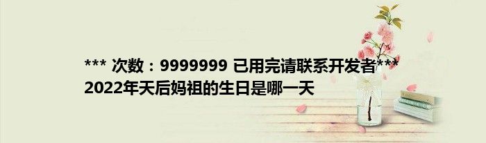 大家好,综合小编来为大家讲解下。*** 次数:9999999 已用完请联系开发者*** 2022年天后妈祖的生日是哪一天这个很多人还不知道,现在让我们一起来看看吧!