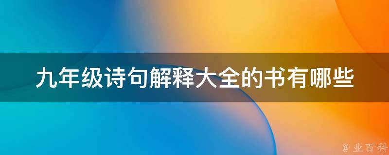 九年级诗句解释大全的书有《九年级古诗词大全》《初中古诗文全注全译全解》《九年级古诗文赏析汇总》等。因为古诗词炼字多在动词、形容词、数量词、虚词上表情达意,所以思考时,也应该多从动词的动静、拟人效果,从形容词的修饰性、色彩感等,赏析句子。