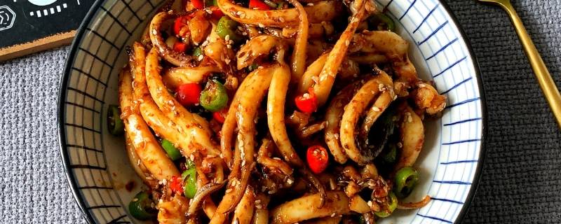 4、待蒜末微黄时,加入鱿鱼须。