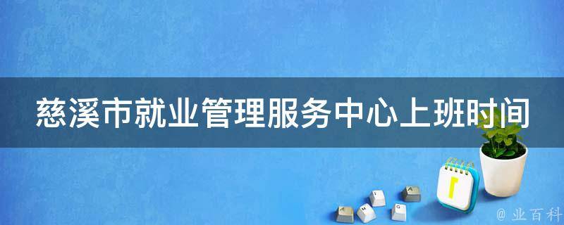 最佳答案慈溪市就业管理服务中心上班时间:夏季工作日上午8:00-11:30,下午14:00-17:00;冬季工作日上午8:00-11:30,下午13:30-16:30。机构职能:组织实施促进就业、统筹城乡就业、创业带动就业政策相关工作;推动创业带动就业,组织实施创业指导和服务;组织实施就业登记和失业登记制度相关工作,指导基层...
