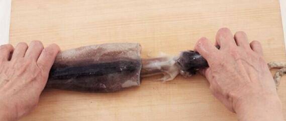 2、左手压住乌贼鳍,右手抓住连接足部的根部位置,便可将内脏拔除,然后把手指伸进里面掏出软骨。