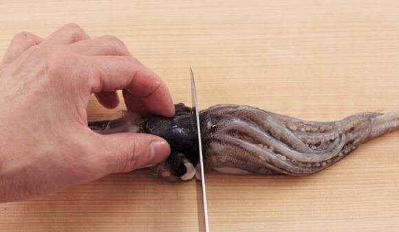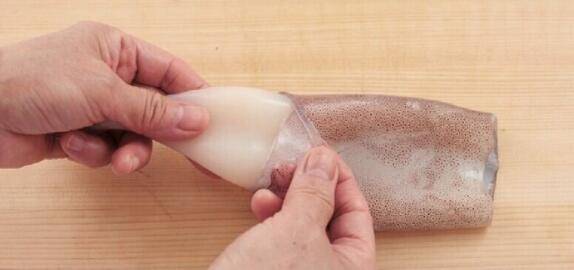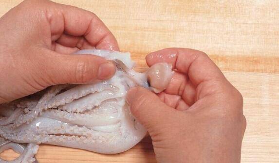 9、在乌贼足部中心有坚硬的口器,以指尖朝口器推压,然后将它拉出来。