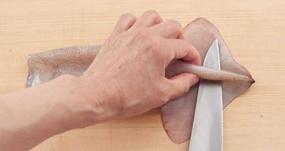 4、将连接乌贼鳍的部位朝下,菜刀由身躯和乌贼鳍之间下刀,从乌贼鳍的上方来剥除。