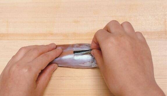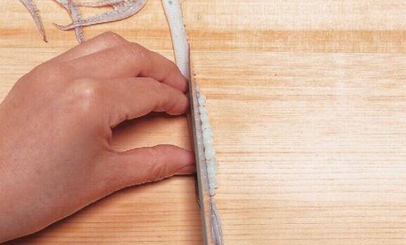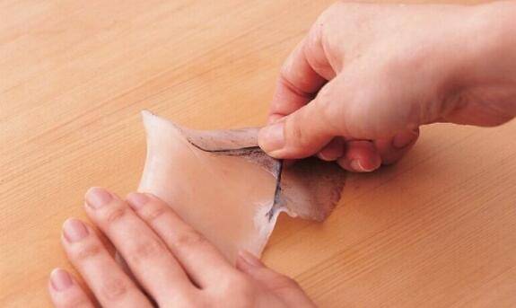 6、在乌贼鳍的表面中央纵向划下切痕,并从这里将皮剥掉。