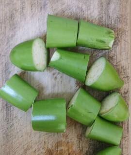 1、茄子泡过洗净,把四个茄子切成大小相等的段,备用。