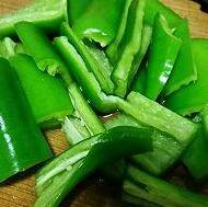 然后青椒切片或者切丝,随个人喜欢,也可以根据个人吃辣的程度换或者添加红辣椒,让成品更美观。