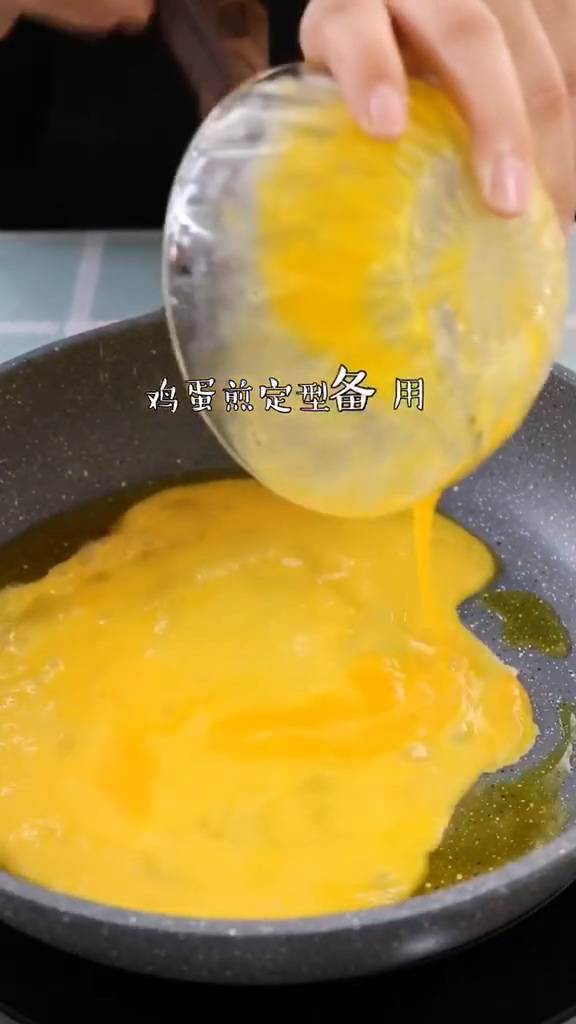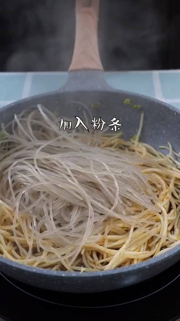 6、加入粉条,将粉条煮软后,加入鸡蛋、韭菜、盐,翻炒至韭菜变色出锅即可。