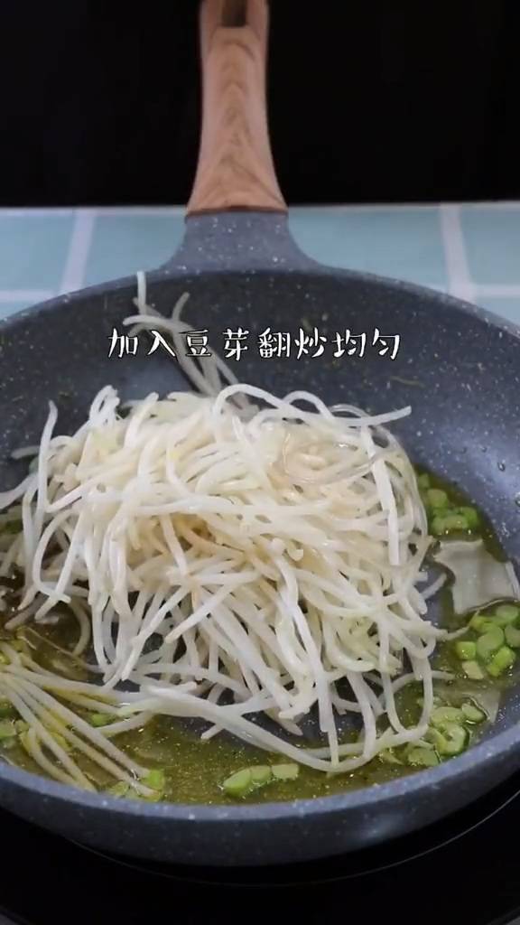 5、加入豆芽翻炒均匀,加入两勺生抽一勺蚝油,翻炒均匀。