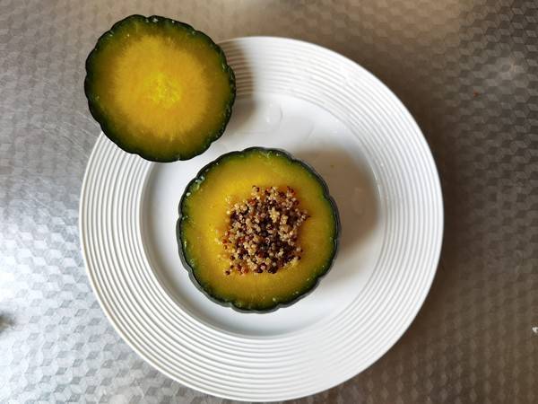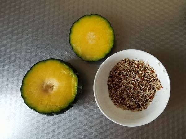 1、准备材料:南瓜一个、藜麦一小碗、黑胡椒粉适量、橄榄油2勺。