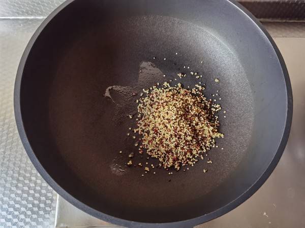 5、干净不粘锅中倒入橄榄油,小火微微热油,放入蒸熟的藜麦,翻炒一会。