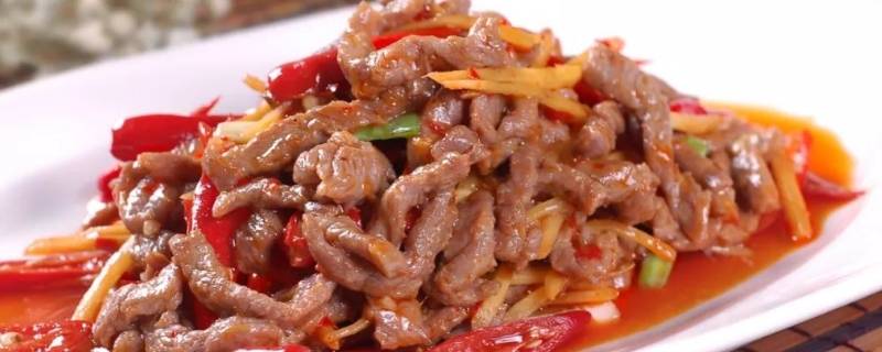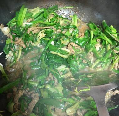 热锅放油,爆香姜片后倒入牛肉丝,待快变色时放入蒜白翻炒,炒至断生。