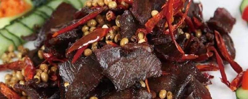 用料:牛干巴适量、蒜苗叶2根、干辣椒适量、花椒粒适量、姜片适量、料酒、鸡精。