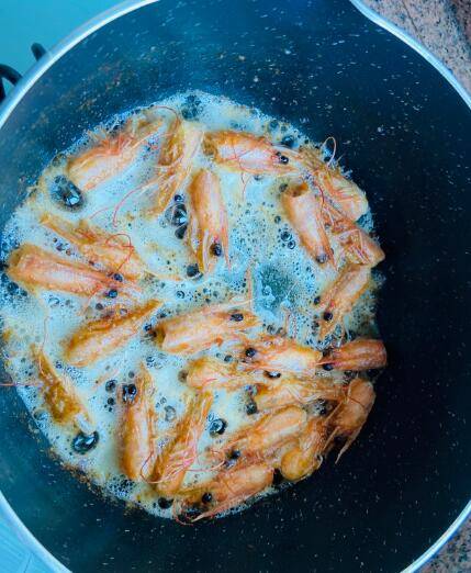 3、锅里倒入油放虾头熬出红虾油。