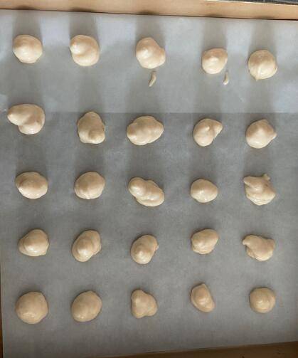 7、把虾泥挤好、上面铺一张油纸、随便找一个圆的平面模具一个个压一下,注意不能压太薄,不然烤起来容易焦。