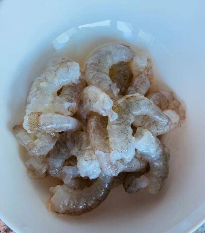 2、虾剥干净,放葱姜水里泡几分钟,捞起沥干备用。