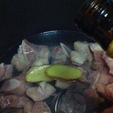 2、牛肋排解冻后用水泡出血水,把牛肋排放入锅里加姜片绰水,煮开变色后捞出冲掉血沫。