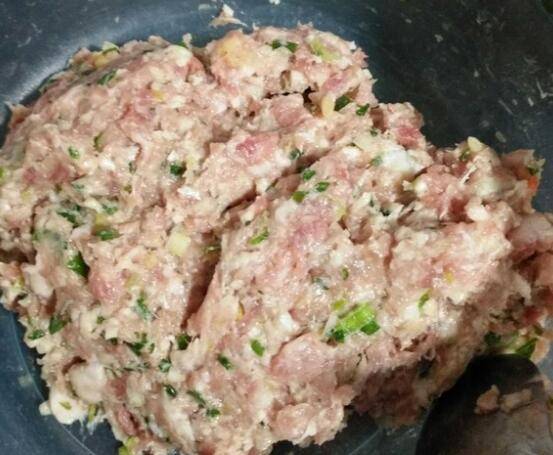 1、瘦肉、香葱、白萝卜混合剁成肉馅,根据自己的口味,加入香菜等香料。
