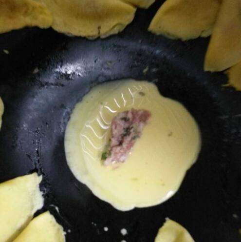4、蛋皮半干时加入肉馅,注意不能等蛋皮完全成形再加入肉馅。