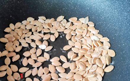 锅烧热,把晒好的南瓜子倒入,转小火,反复翻炒。