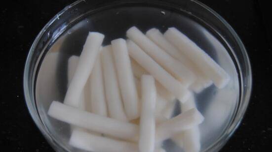 4、准备好一碗冷水,捞出年糕放入冷水碗内,把年糕切成半个手指长度。