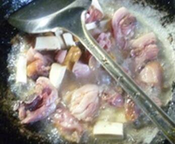 3、倒入切好的豆干,加适量的清水,翻动之后煮开。
