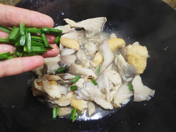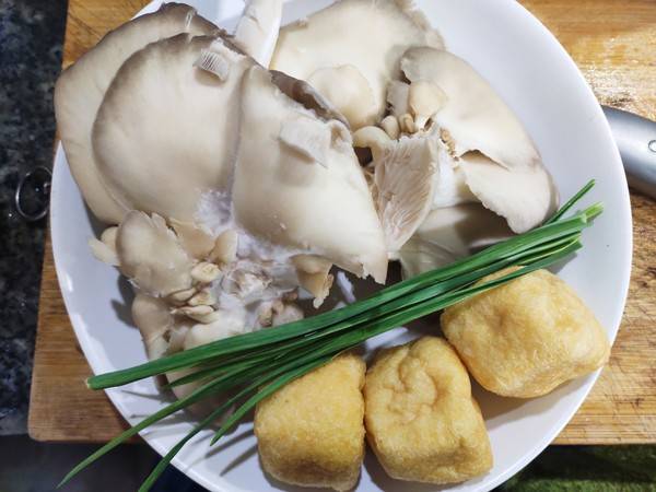 1、准备材料:平菇400克、油豆腐3个、大蒜叶10克、盐2克、料酒5克、油适量。