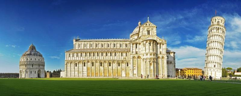 比萨斜塔。比萨斜塔建造于1173年8月,是意大利比萨城大教堂的独立式钟楼,位于意大利托斯卡纳省比萨城北面的奇迹广场上。奇迹广场的大片草坪上散布着一组宗教建筑,它们是大教堂、洗礼堂、钟楼和墓园,外墙面均为乳白色大理石砌成,各自相对独立但又形成统一罗马式建筑风格。比萨斜塔位于比萨大教堂后面。