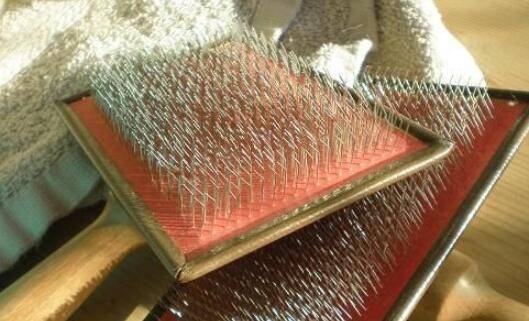 针梳。将净毛梳成条状的羊毛条,梳毛机将毛中的草杂再梳下来一些,将洗净毛梳理成网状。