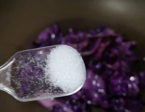 4、蒜香味炒出来后,放入处理好的紫甘蓝,快速翻炒,加入适量盐,炒3分钟即可。