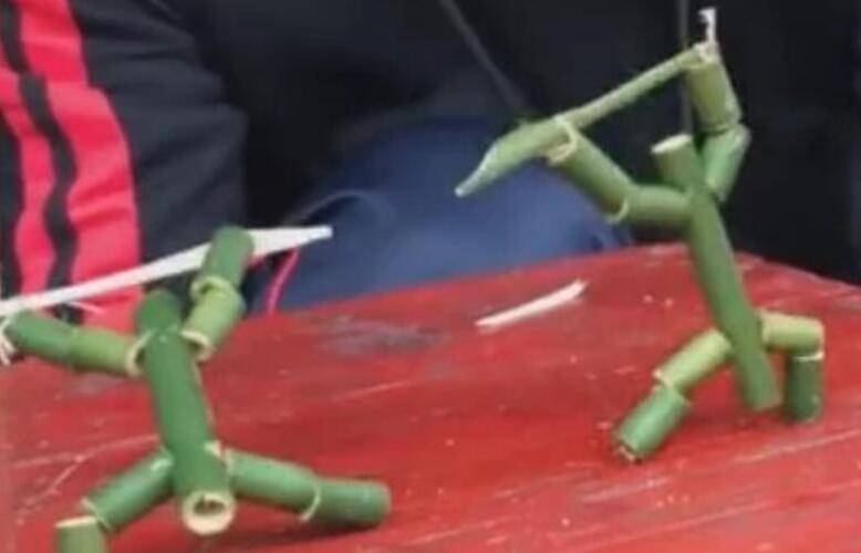 4、竹节人的玩法,可以把有着九个竹节的鞋线嵌入课桌裂缝里,从下面拉紧,在裂缝上的竹节人就站起来,叉腿张胳膊、将鞋线一松一紧,竹节人就会动起来。两个竹节人放在一起,也可以进行搏斗。