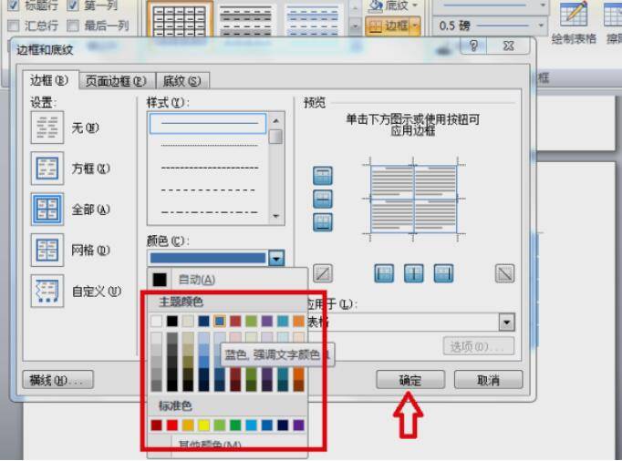 4、然后在窗口的“边框”页面中设置颜色类型,设置完后点击“确定”按钮。