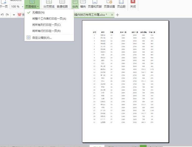 点击“打印预览”选项卡下的“页面缩放”,在“将整个工作表打印在一页”前面打上对勾;