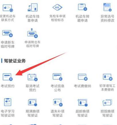 4、向下滑找到驾驶证业务,点击考试预约。如果你已经通过考试,系统就会显示该科目已考试合格,无需预约。如果能点进去预约,则证明没有通过考试。