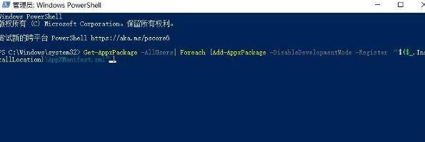 2、随后输入代码Get-AppxPackage -AllUsers| Foreach {Add-AppxPackage -DisableDevelopmentMode -Register “$($_.InstallLocation)AppXManifest.xml”}。