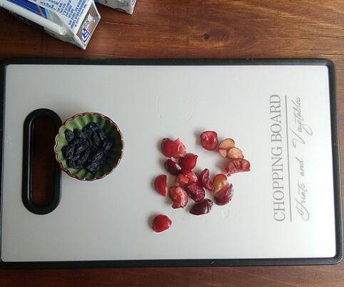 加入樱桃、葡萄干、蔓越莓干、杏仁。放入冰箱中冷冻至酸奶冻硬就可以。