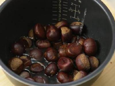 3、烧水:烧水然后加入板栗、冰糖,水要没过板栗。