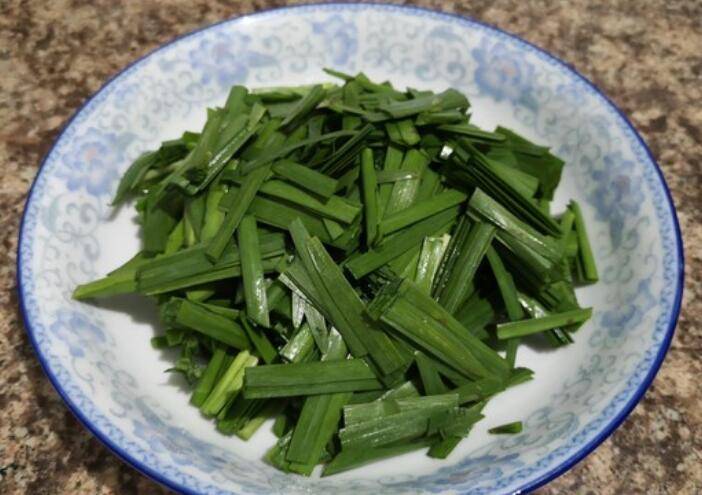 1.韭菜一根根洗净,再切成段,控干水分装入盘中备用。