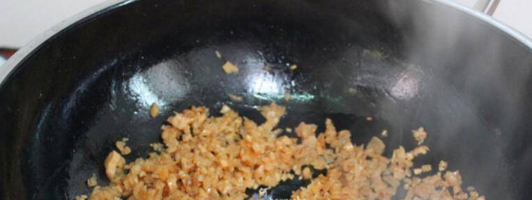4、热锅,往锅里放入适量的食用油,倒入切碎的萝卜干,小火煸炒至萝卜干散发出微微的香味。