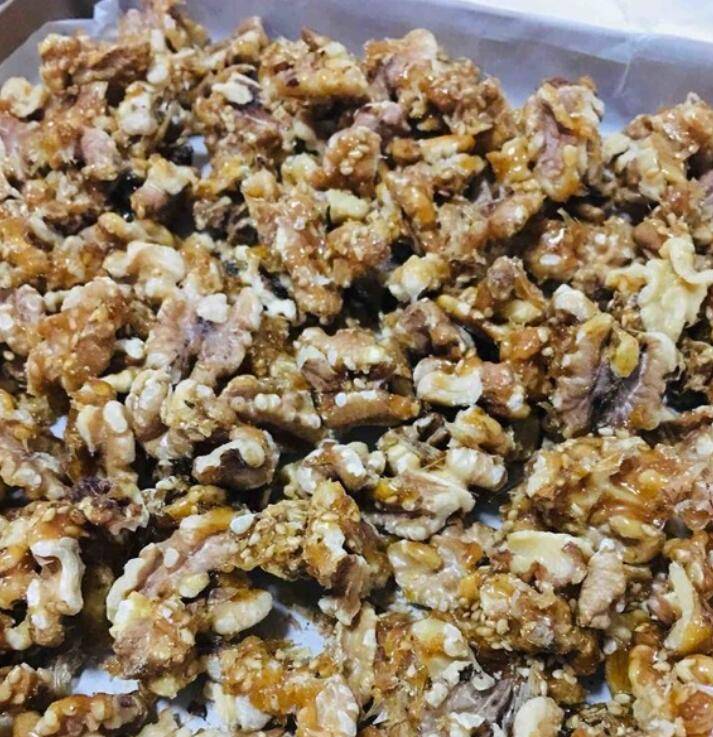 5、基本上每个核桃仁上蘸上糖浆即可出锅。