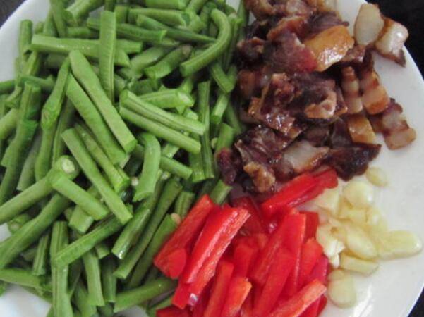 1.把豇豆摘洗干净,备好腊肉、蒜和红尖椒。