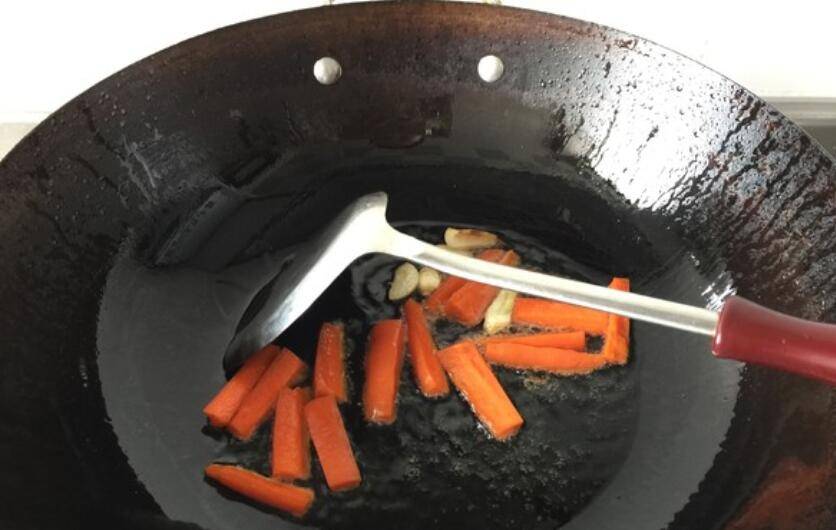4、先放入胡萝卜翻炒。