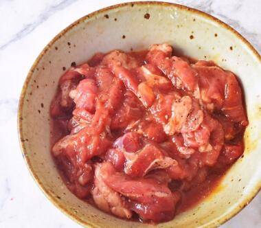 5、再把腌制好的牛肉片放在洋葱上,尽量把牛肉片摊开。