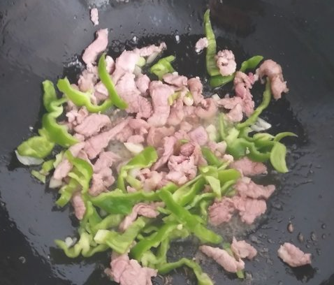 锅中倒入花生油,加入肉丝炒得肉色发白,再加入蒜末炒香。