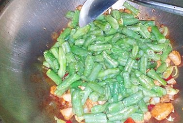 倒入豆角丁、加盐、十三香,鸡精调味并翻炒均匀;