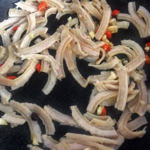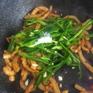 6、放入青椒加少许糖、盐翻炒均匀即可。