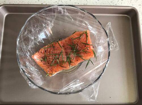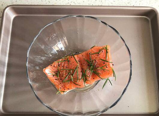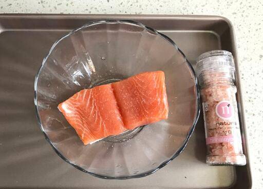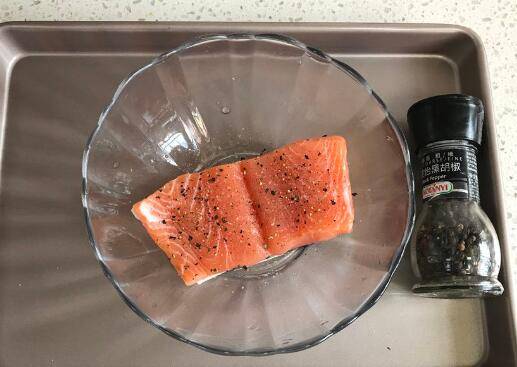 用料:三文鱼柳一块、海盐适量、黑胡椒适量、郎姆酒5克、橄榄油5克、迷迭香适量。