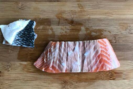 1、新鲜的三文鱼柳洗净后去皮。