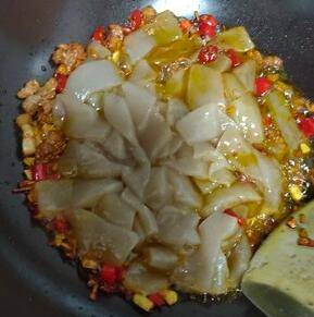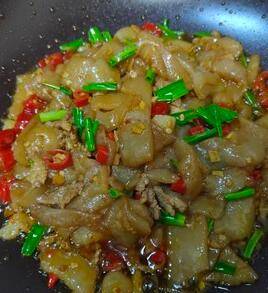 7、把魔芋片倒入,翻炒均匀。