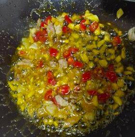 6、放入肉末炒变色,加入剁椒炒出香味。