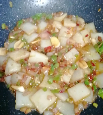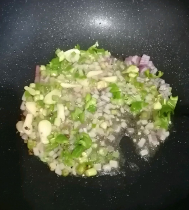 起锅热油,放入洋葱、辣椒、葱花、以及蒜片炒出香味。